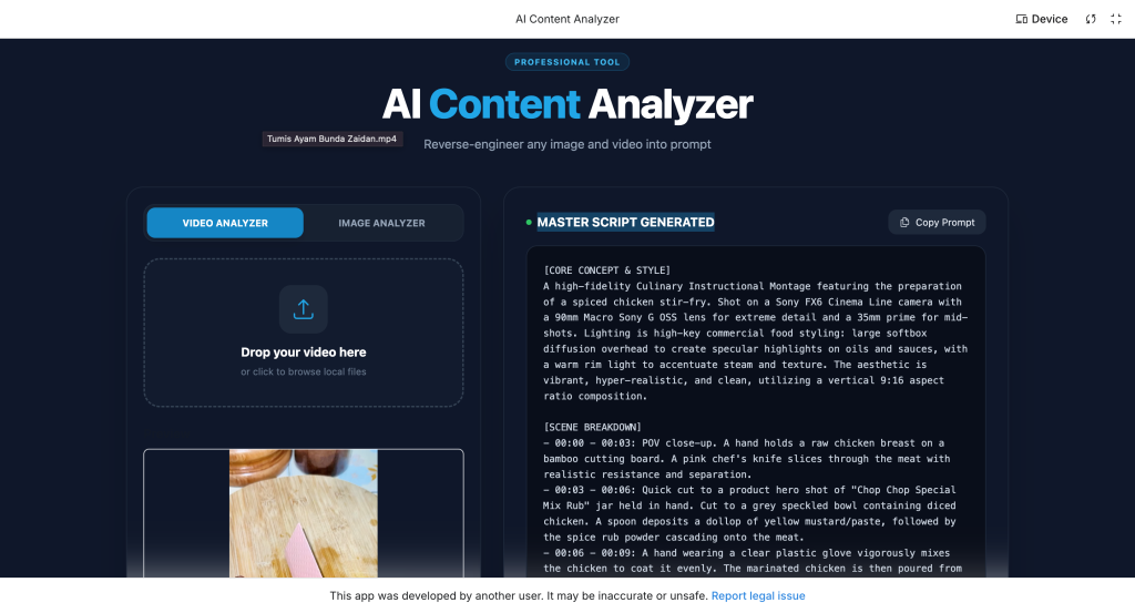 Fungsinya sederhana namun mematikan: reverse-engineer video atau gambar menjadi sebuah “blueprint konten”, lalu mengeluarkan MASTER SCRIPT yang bisa kamu pakai sebagai acuan produksi.