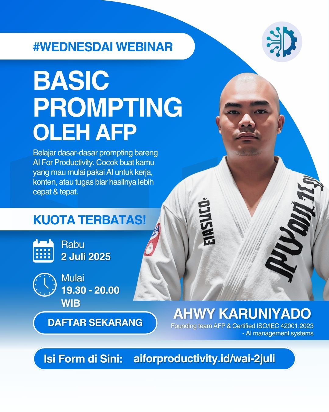 Belajar dasar-dasar prompting bareng AI For Productivity. Cocok buat kamu yang baru mulai pakai AI (ChatGPT, Qwen, DeepSeek) untuk ngerjain pekerjaan lebih cepat & presisi.